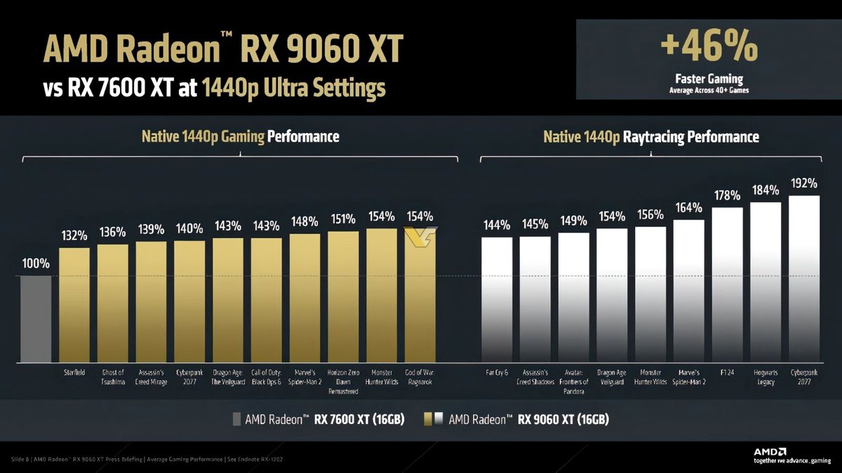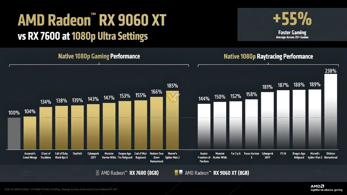 Согласно тестам, проведенным AMD в нескольких десятках игр, Radeon RX 9060 XT в среднем на 55% быстрее Radeon RX 7600 XT в разрешении 1080p на ультра-настройках и на 46% быстрее в разрешении 1440p (тоже на ультра-настройках).