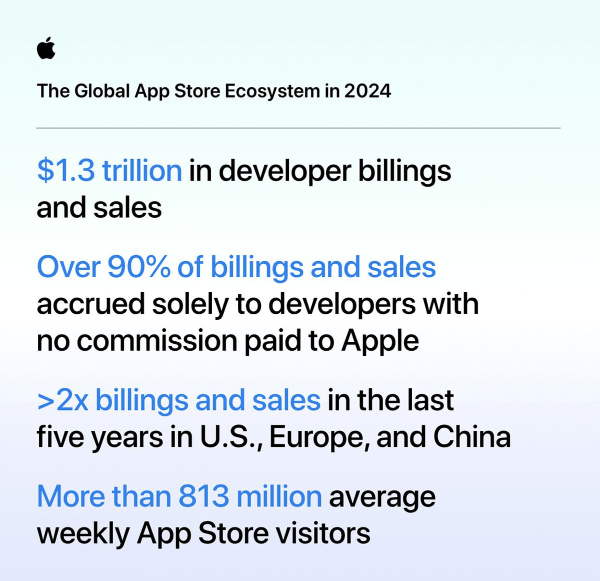 Корпорация Apple опубликовала результаты исследования, призванного оценить объем рынка приложений для App Store в денежном выражении. Утверждается, что в 2024 году объем рынка достиг $1.3 триллиона.