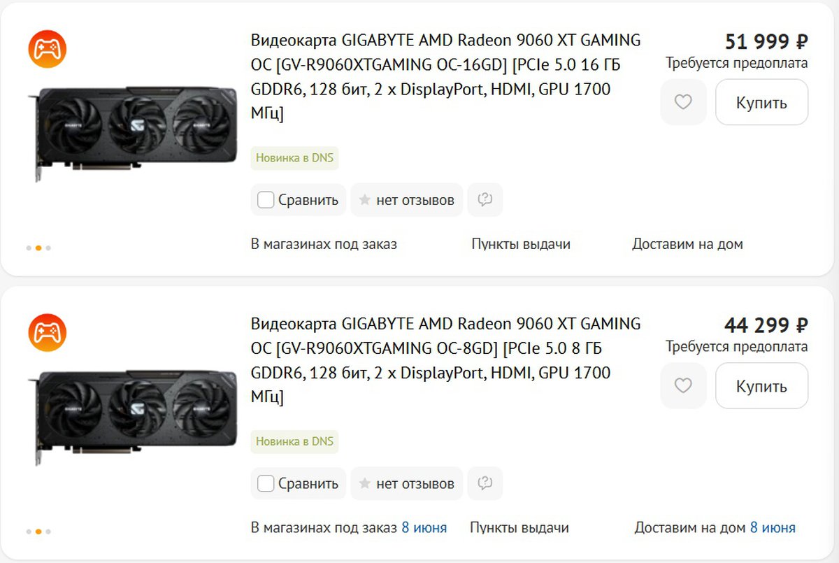 На Регарде карты с 16 гигабайтами памяти стоят 65-67 тысяч рублей в зависимости от модели. Остальные крупные ритейлеры пока не начали продажи Radeon RX 9060 XT.