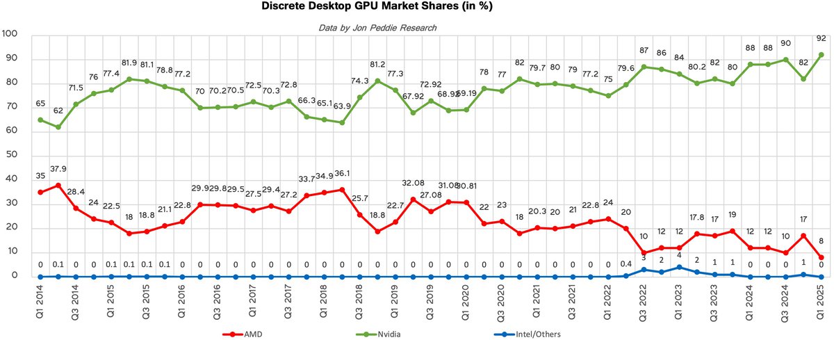 По итогам первого квартала 2025 года доля AMD на рынке десктопных видеокарт сократилась до 8%, следует из отчета Jon Peddie Research. Это худший показатель за всю историю наблюдений.