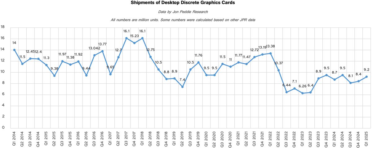 При этом поставки видеокарт сейчас показывают устойчивый рост: в последнем квартале было отгружено 9.2 миллиона экземпляров против 8.1 миллиона двумя кварталами ранее. Правда, в начале 2024 года поставки были еще выше — сейчас они отрастают после падения.