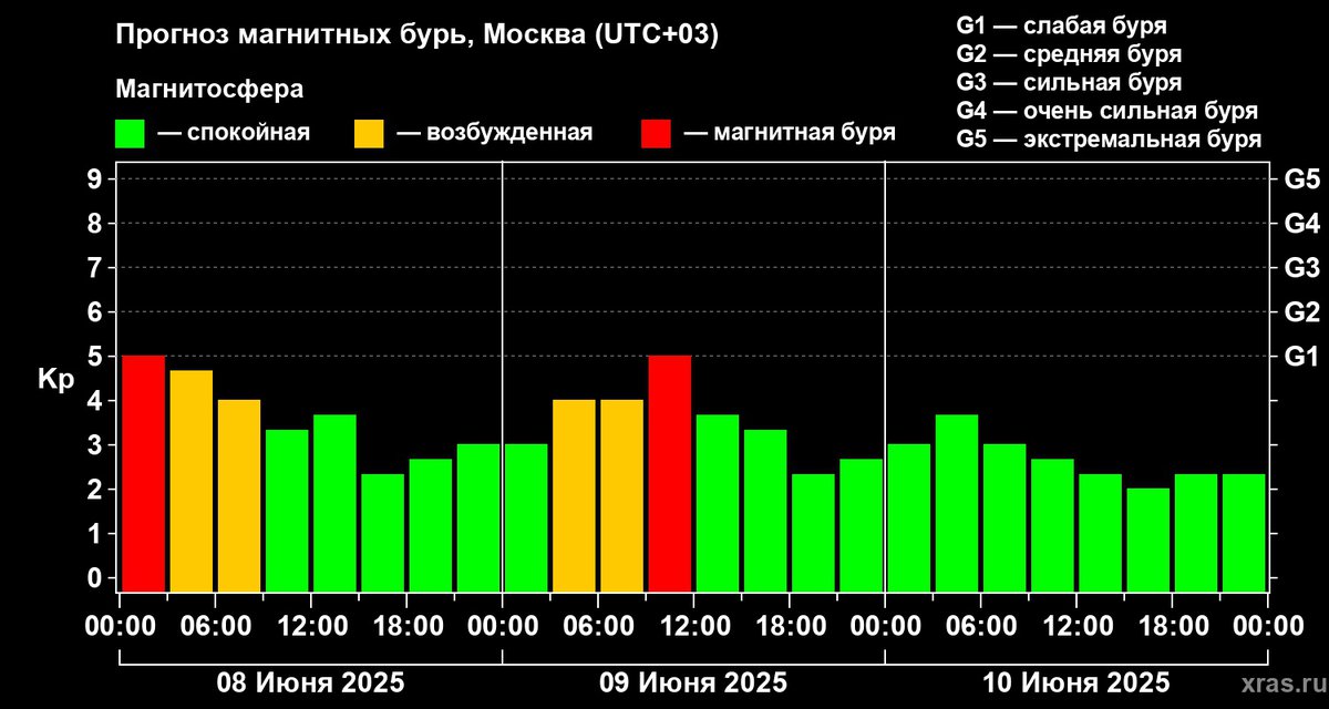 Похожий прогноз дают и аналитики Лаборатории солнечной астрономии ИКИ и ИСЭФ. Полноценная геомагнитная буря 9 июня может начаться в районе 9 утра по Москве и продолжаться до полудня, но есть вероятность, что она стартует раньше.