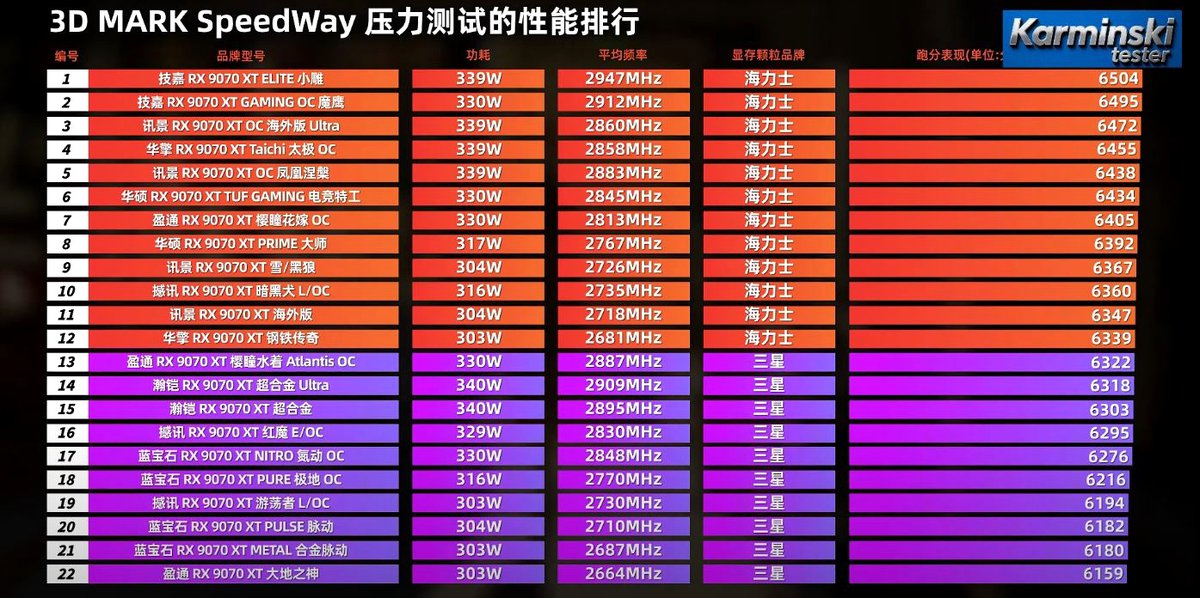 В ходе тестов было проверено два десятка видеокарт: 12 Radeon RX 9070 XT с памятью SK Hynix и 10 устройств с памятью Samsung. Самая медленная карта с памятью SK Hynix оказалась быстрее самой быстрой карты с памятью Samsung.