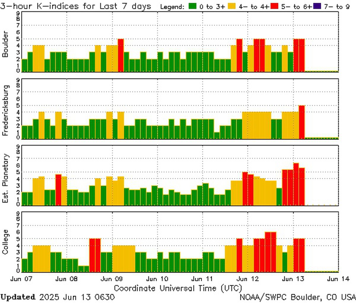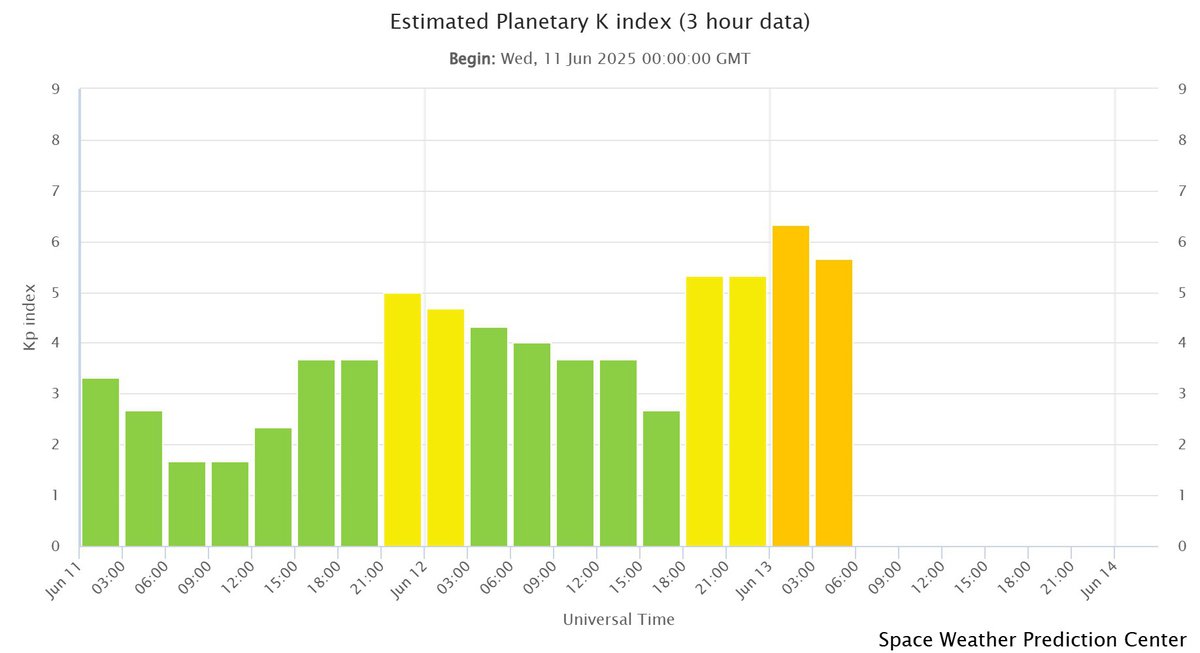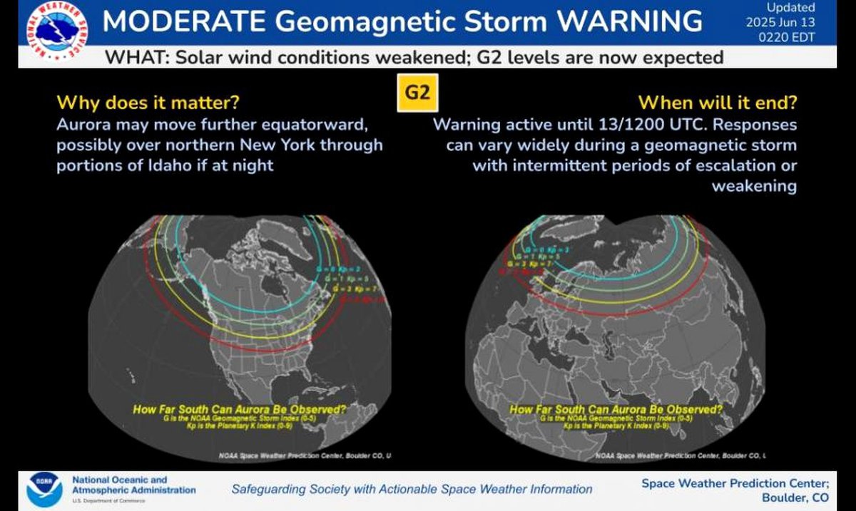 Геомагнитная буря 13 июня, следует из данных детекторов NOAA США, началась с класса G1; в некоторых регионах сила бури находится на уровне класса G2. Существует вероятность, что буря дополнительно усилится и достигнет класса G3.