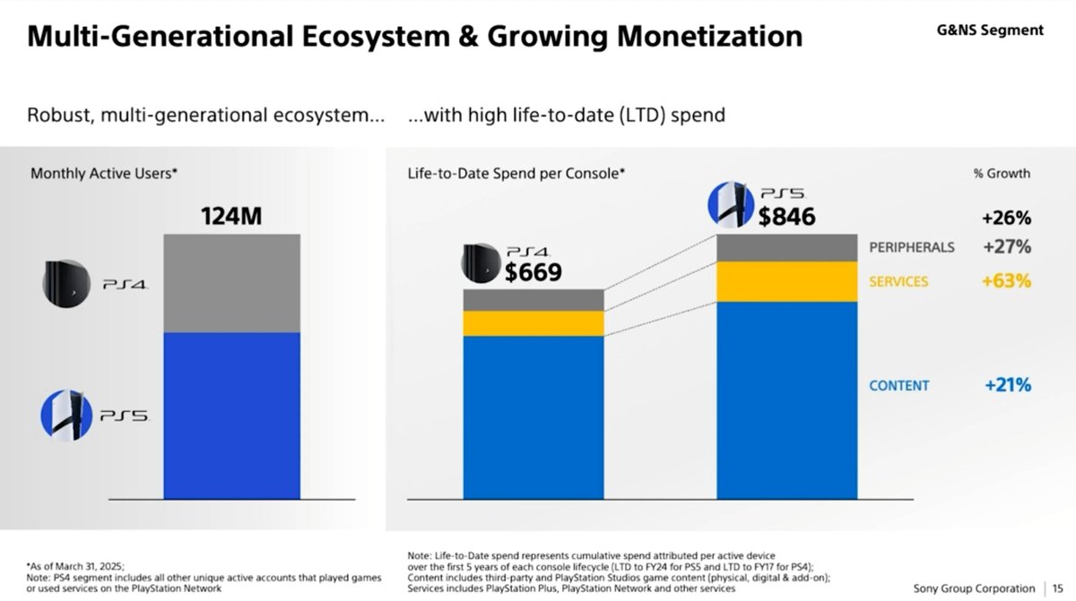По оценке Sony, по состоянию на март 2025 года месячная аудитория двух поколений консолей компании была на уровне 124 миллионов человек, причем на долю PlayStation 5 приходилось заметно больше половины игроков.