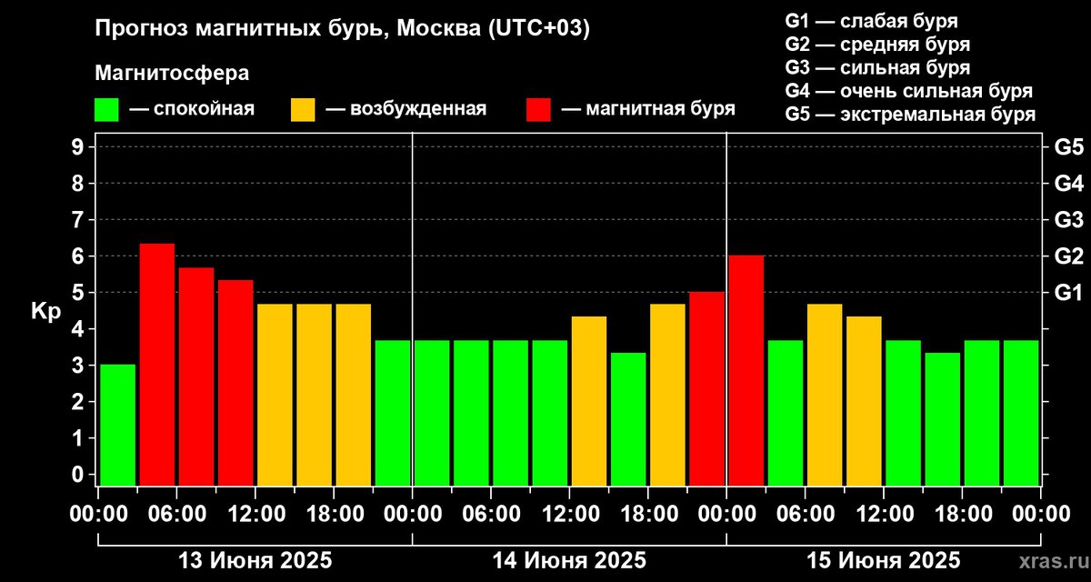 Похожий прогноз дают и российские аналитики, но их оценка выглядит более благоприятной — предполагается, что день пройдет более-менее спокойно, но ночная геомагнитная буря 14-15 июня все-таки никуда не денется.