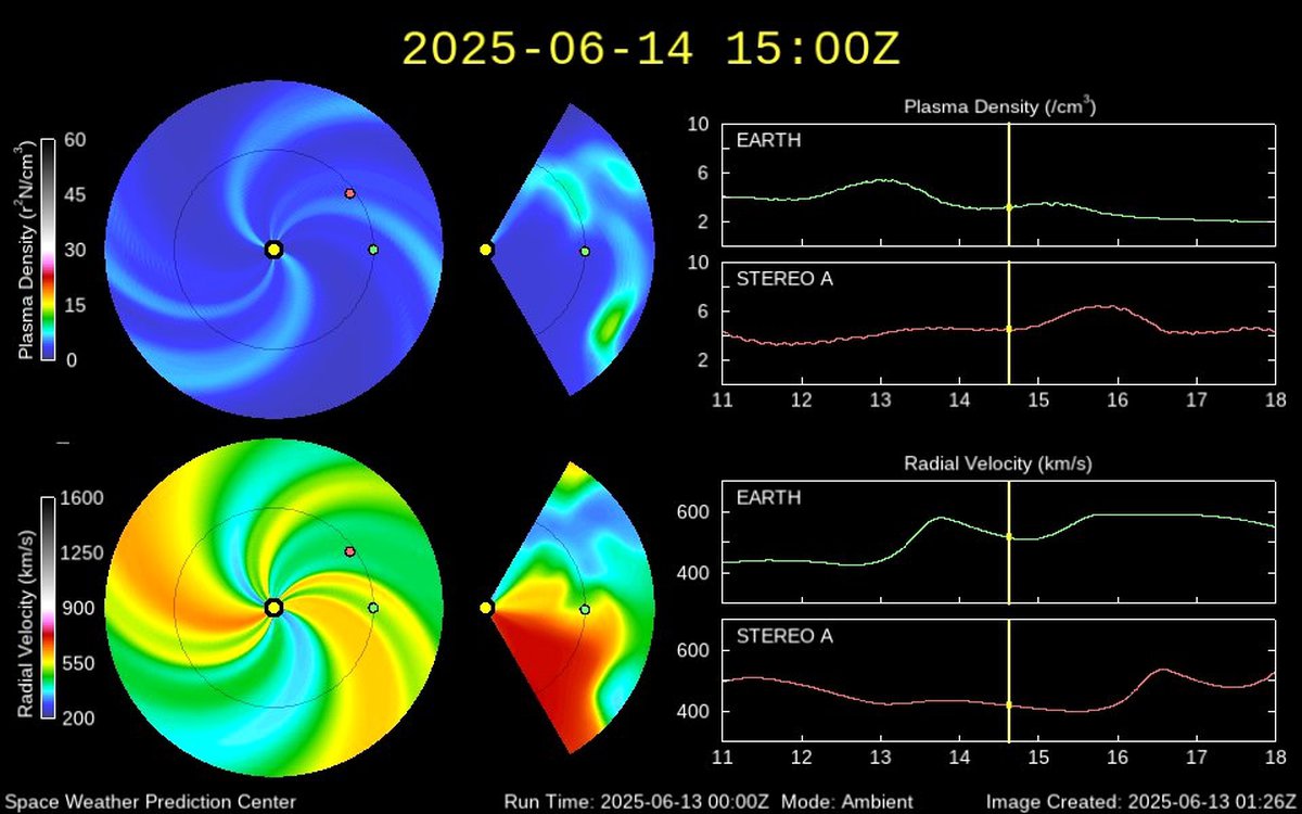 14 июня Земля продолжит проходить через поток солнечного ветра, считают аналитики NOAA США и Лаборатории солнечной астрономии ИКИ и ИСЭФ. 13 июня вхождение в этот поток вызвало геомагнитную бурю, 14 июня геомагнитный фон будет оставаться напряженным.