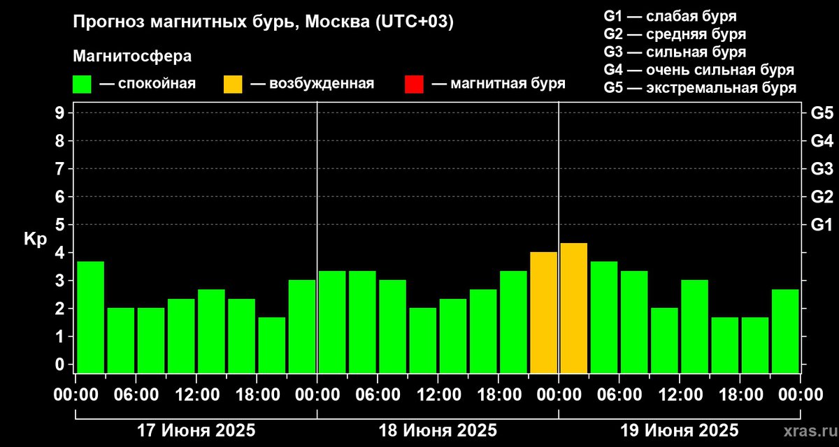 Если ничего не изменится, то геомагнитная обстановка 18 июня будет очень спокойной. Возможно, ближе к ночи по Москве магнитосфера слегка возбудится, но на протяжении всего остального дня не ожидается никаких значимых событий.