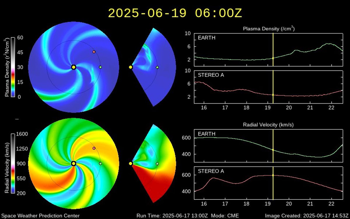 На визуализации хорошо видно, что к Земле приближается фронт быстрых частиц солнечного ветра, но в ближайшие дни он не доберется до планеты. Предполагается, что в худшем случае нас ждет небольшая магнитная буря 20 июня.