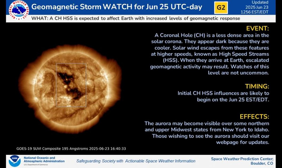 Ожидается, что магнитная буря 25 июня растянется по меньшей мере на сутки. Иногда буря будет немного стихать, опускаясь чуть ниже класса G1, но затем давление потока частиц на магнитосферу снова будет усиливаться.