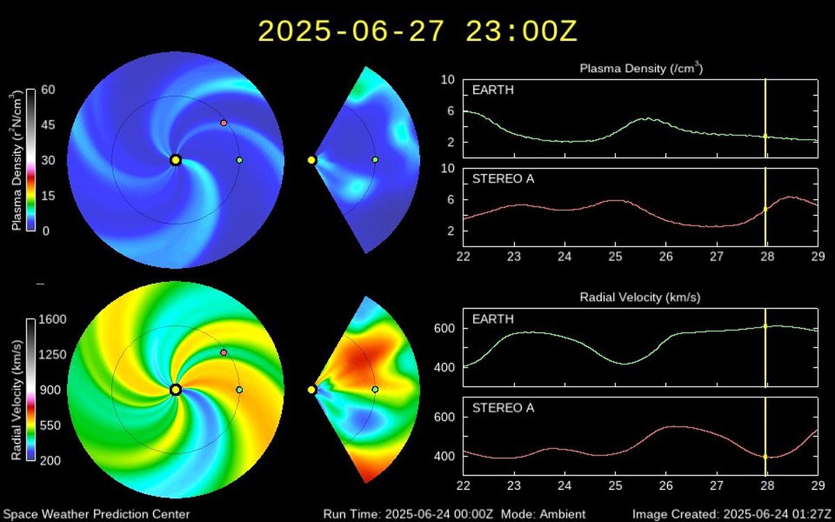 Хотя актуальный прогноз говорит о завершении геомагнитной бури 26 июня, в реальности буря может растянуться на несколько дней. Модель распространения солнечного ветра WSA-Enlil показывает, что Земля будет довольно долго находиться в потоке быстрых заряженных частиц.