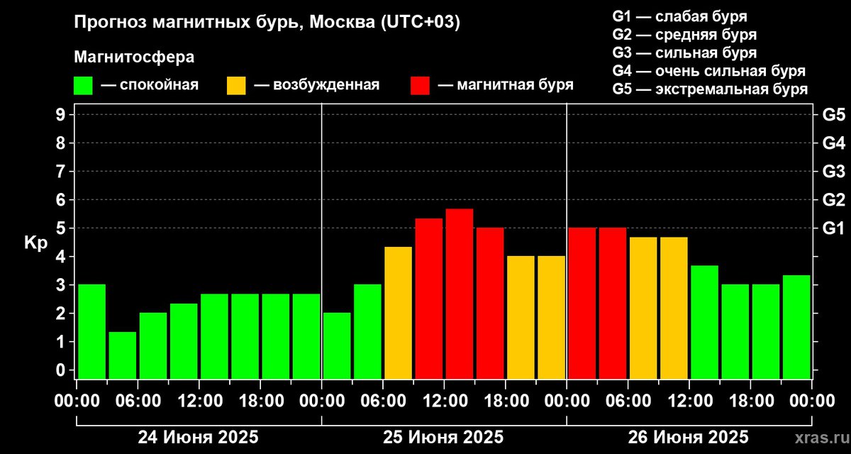 Аналитики NOAA считают, что геомагнитная буря 25 июня начнется в районе 9 утра по Москве. Уровень возбуждения магнитосферы начнет расти рано утром, буря почти сразу достигнет класса G2. Это мнение разделяют и в Лаборатории солнечной астрономии ИКИ и ИСЭФ.