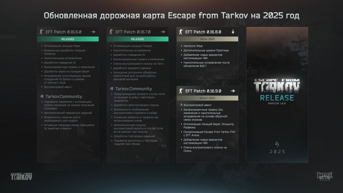 Согласно актуальной версии дорожной карты, выход Escape from Tarkov версии 1.0 все еще запланирован на 2025 год. Релиз игры состоится не раньше сентября, в августе должен выйти обычный патч 0.16.9.0.