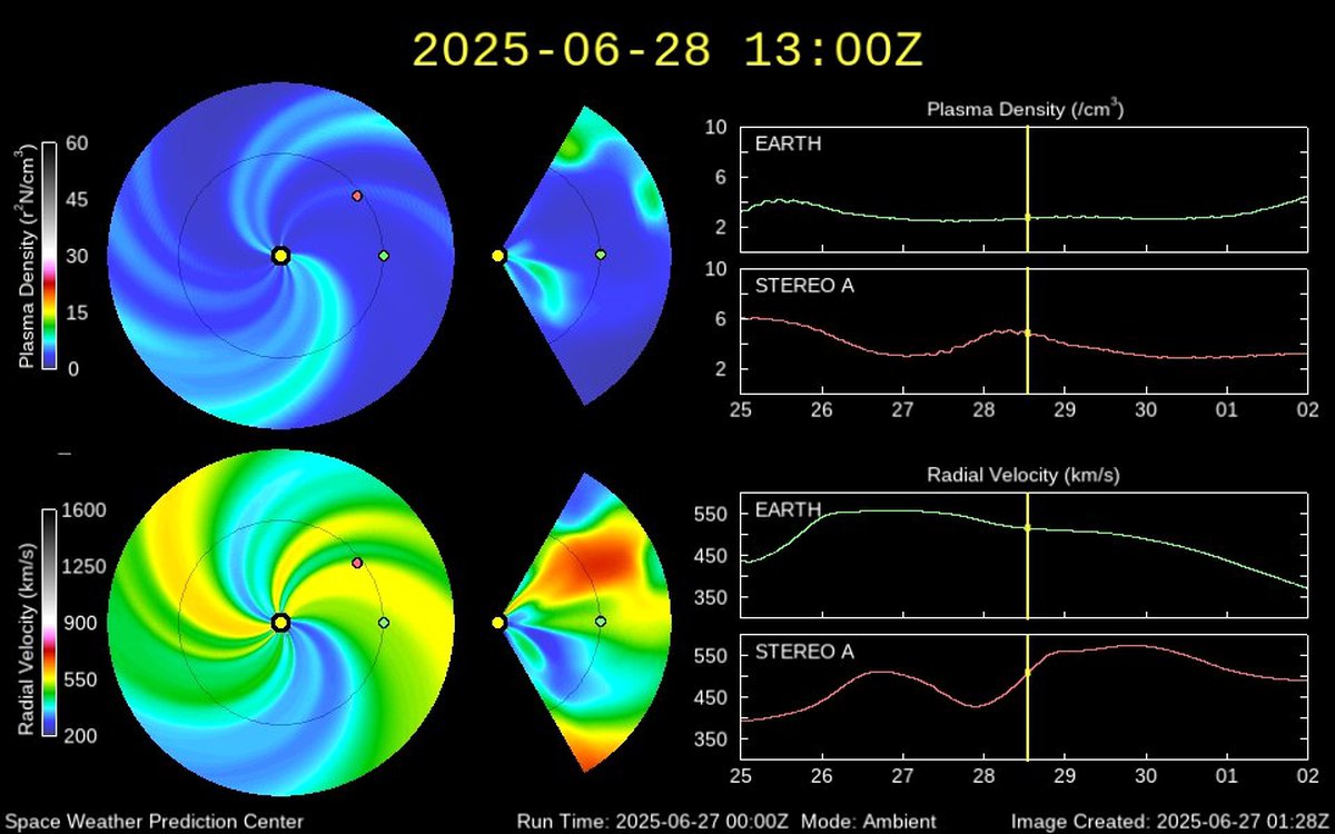 Актуальная модель распространения солнечного ветра тоже показывает минимальную вероятность геомагнитной бури 28 июня. Скорость потока частиц все еще может быть выше обычной, но до магнитной бури дело не дойдет.
