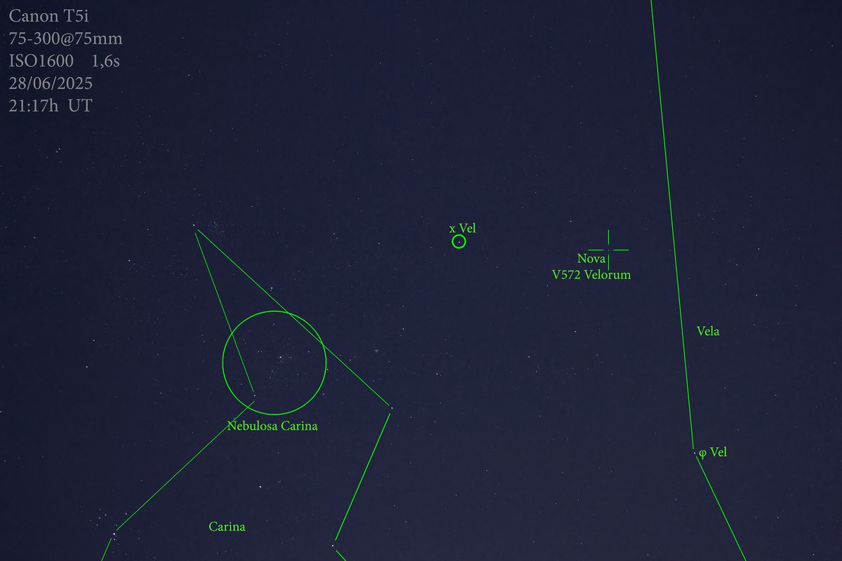На небосводе обнаружена еще одна новая звезда. Небесное тело V572 Velorum обнаружено в созвездии Парусов; это уже вторая новая, найденная в июне, перед этим исследователям долго не удавалось находить такие звезды.