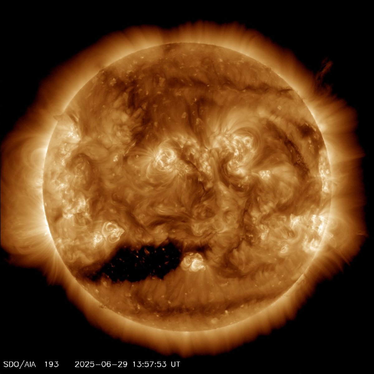 Крупная корональная дыра в атмосфере Солнца пока тоже не грозит Земле магнитной бурей. Поток солнечного ветра из такой дыры может инициировать геомагнитную бурю, но нынешняя дыра находится в южном полушарии Солнца, слабо связанном с Землей.