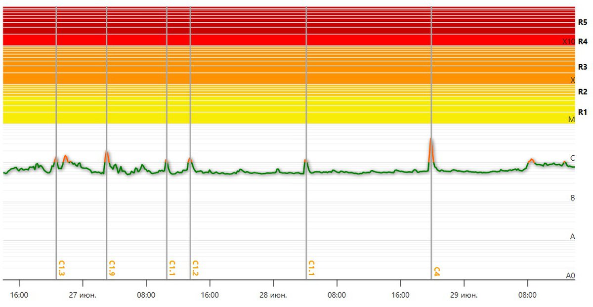 Это объясняется отсутствием в последнее время мощных вспышек на Солнце и корональных выбросов массы. Существовала вероятность, что от Солнца оторвутся крупные протуберанцы, способные полететь в сторону Земли, но этого не произошло.