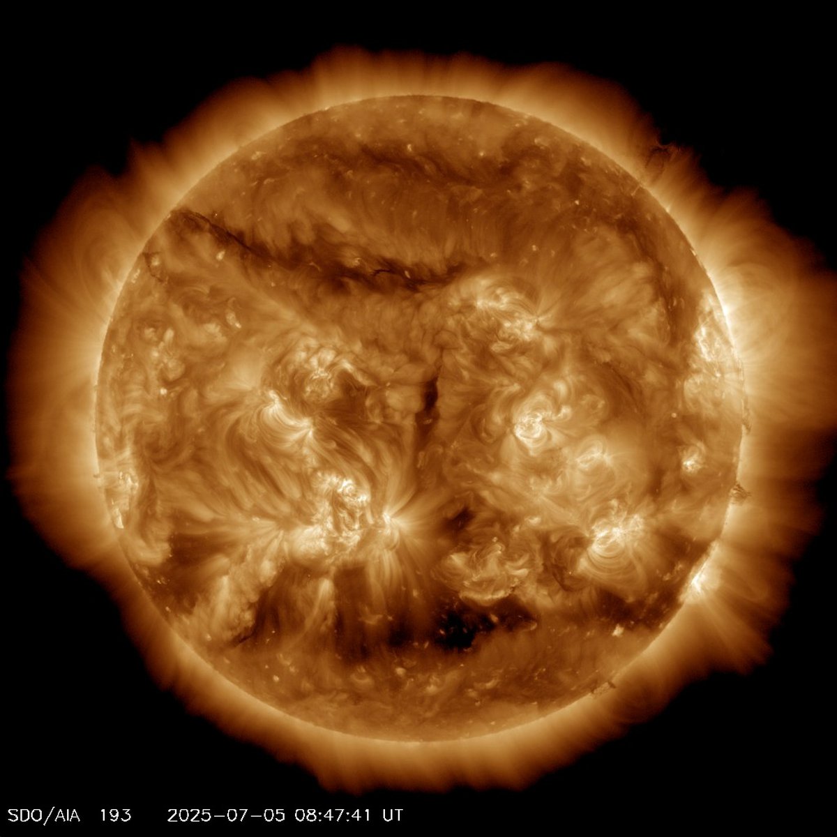 Кроме того, сейчас на Солнце отсутствуют крупные корональные дыры. Небольшая дыра есть в южном полушарии звезды, но это полушарие слабо связано с Землей: даже крупные дыры здесь не инициируют магнитные бури.