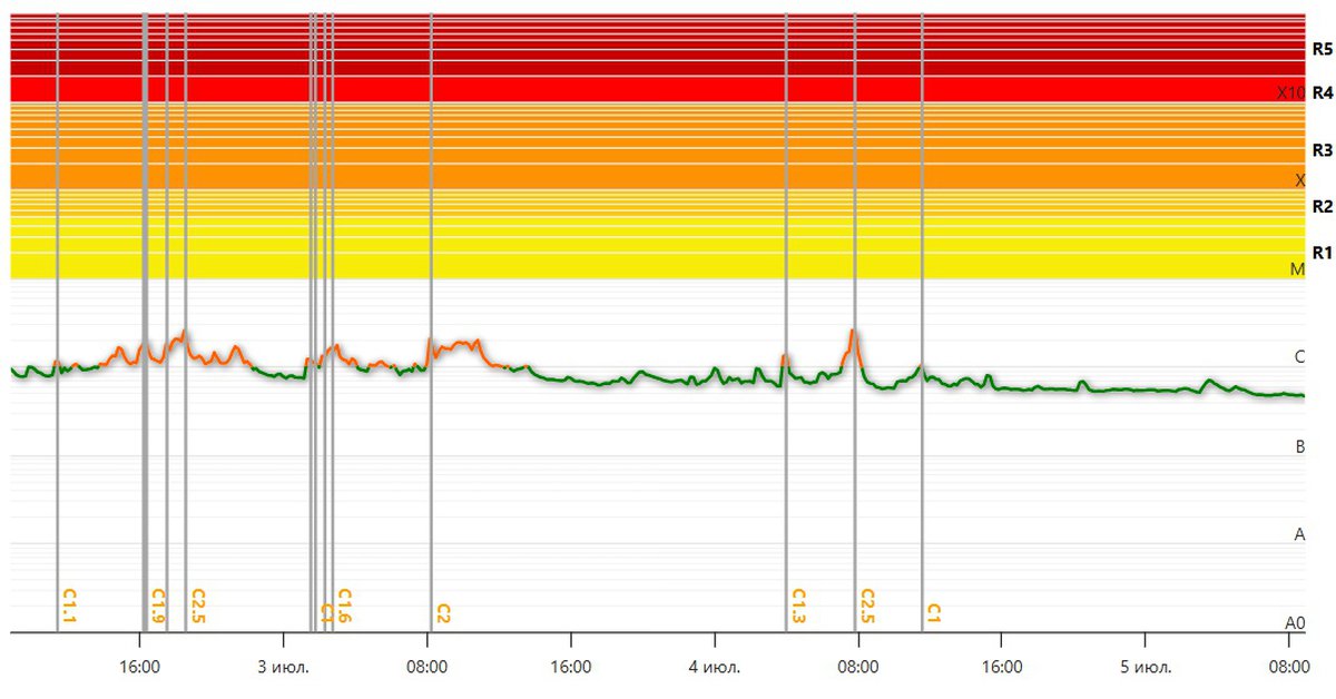 Последняя вспышка класса X регистрировалась на Солнце еще 19 июня, вспышки класса M не фиксировались с 20 июня. Таким образом, затишье в солнечной активности растянулось уже на две недели.