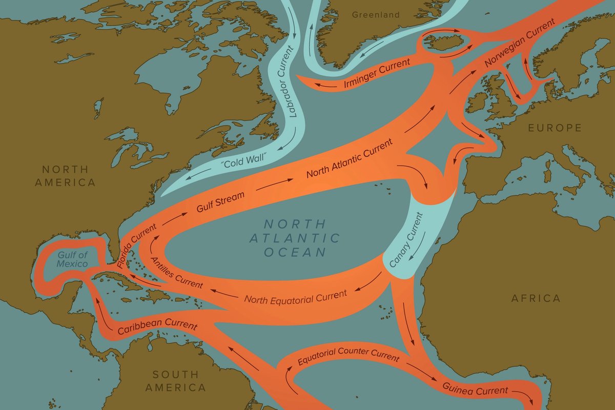 АМОЦ работает как конвейер: холодные, соленые и более плотные воды опускаются на дно у берегов Гренландии, а затем движутся на юг, в то время как теплые воды с юга возвращаются на север по поверхности. В последние годы ученые предупреждали, что этому процессу мешает рост поступления пресных вод из тающих ледников.