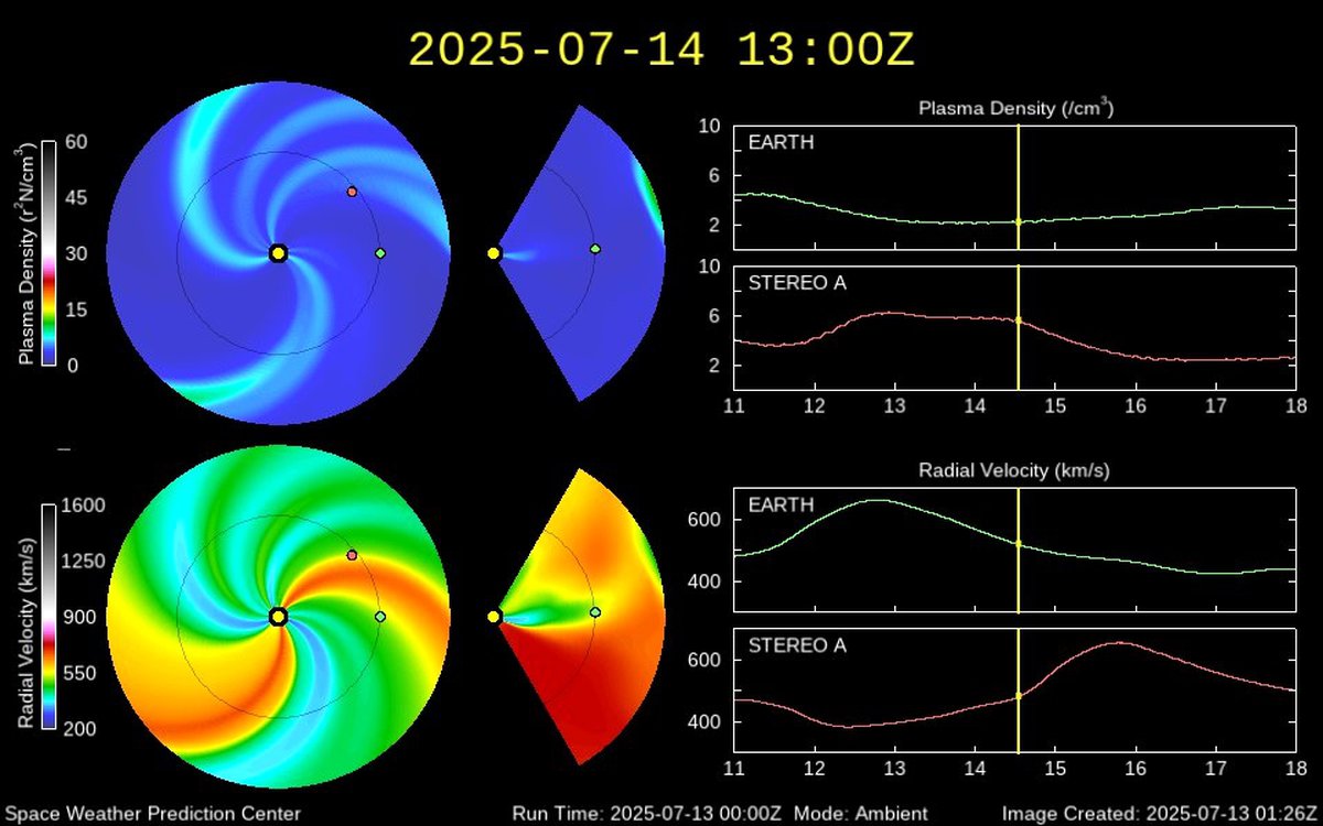 14 июля скорость солнечного ветра в околоземном пространстве составит 450-560 километров в секунду. Этот показатель выше среднего, но его нельзя назвать экстремальным — действительно существенного влияния на магнитосферу такой поток не окажет.