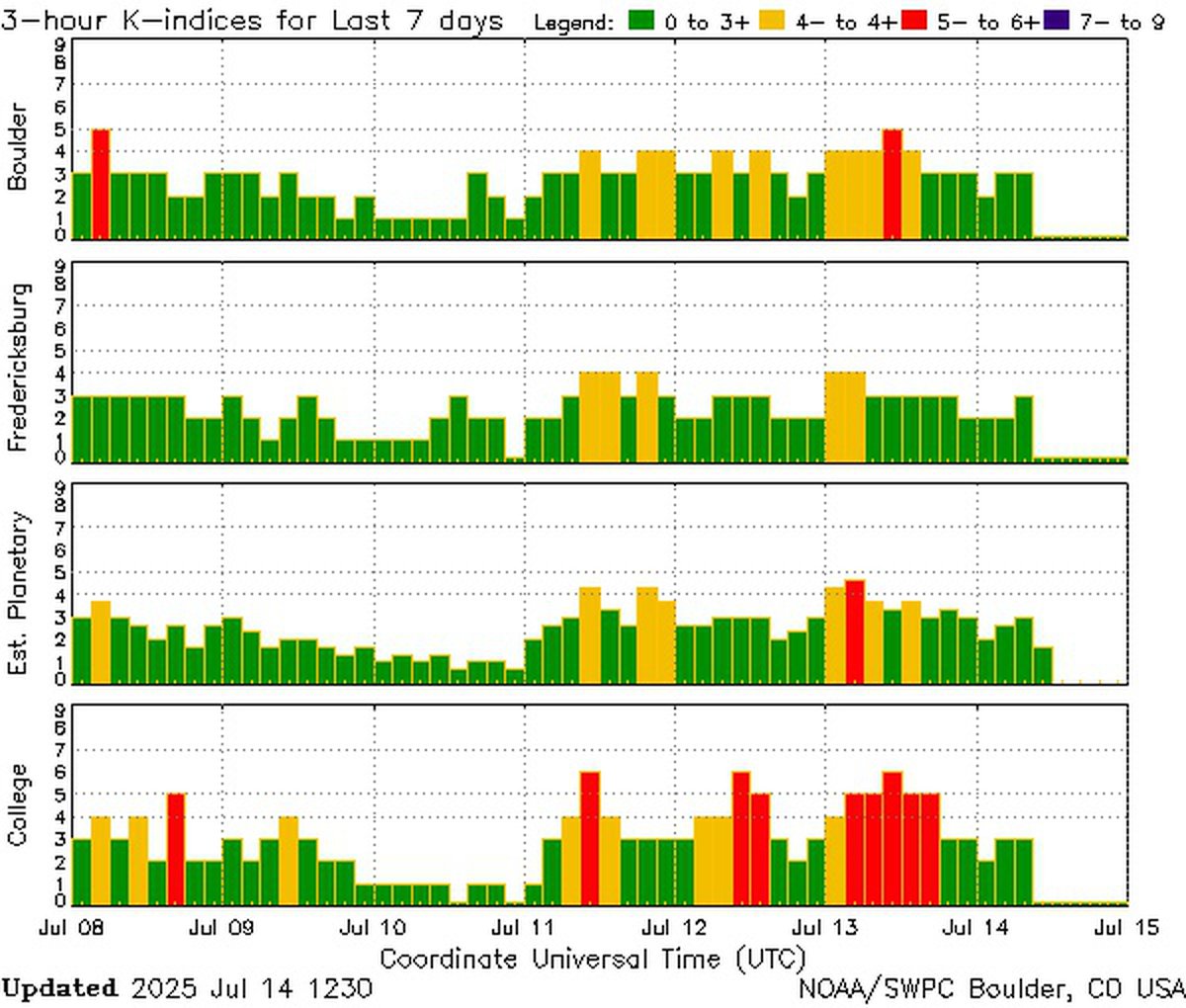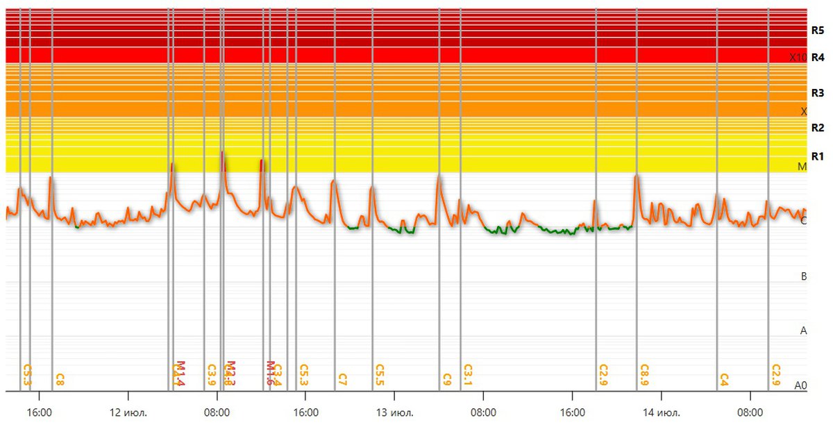 Индекс активности Kp, характеризующий состояние магнитосферы, будет колебаться в пределах 1-3 единиц. Другими словами, в худшем случае магнитосфера будет возбужденной, но о полноценной геомагнитной буре 15 июля речь не идет.