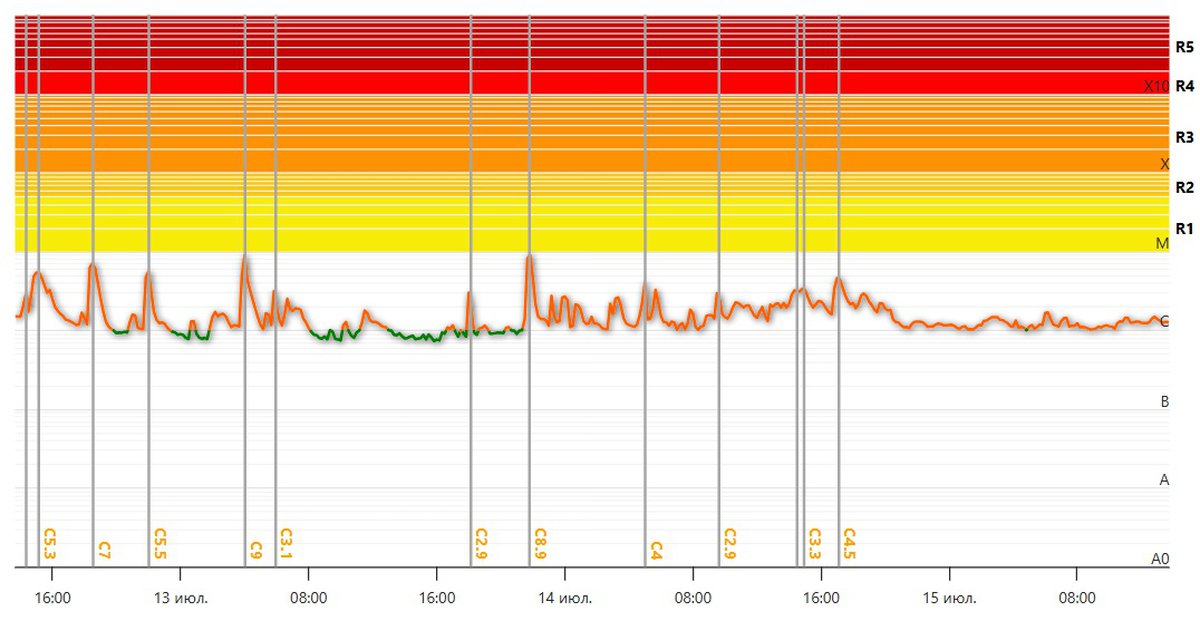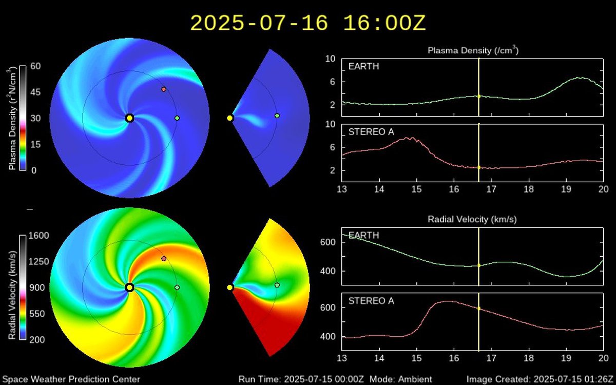 Хотя воздействие высокоскоростного солнечного ветра продолжится, оно не приведет к серьезным магнитным бурям. В худшем случае, считают аналитики, 16 июля мы снова увидим магнитную бурю минимального класса G1.