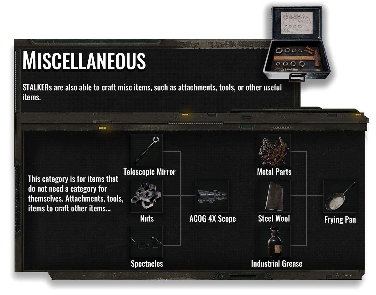 Модификация Craftable Zone дает возможность крафтить медикаменты, еду, обвесы для оружия, патроны и предметы вроде детекторов. Рецепты довольно примечательные: защиту от пси-излучения можно получить с помощью водки, антирада и пластиковой баночки.