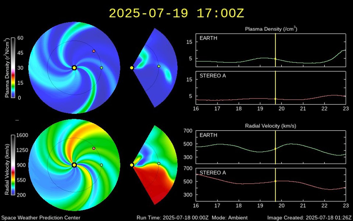 В то же время модель распространения солнечного ветра WSA-Enlil показывает, что Земля будет проходить по самому краю более быстрого потока частиц. Если модель немного ошиблась (такое бывало) и Земля окажется в этом потоке, то 19 июля может произойти магнитная буря класса G1.