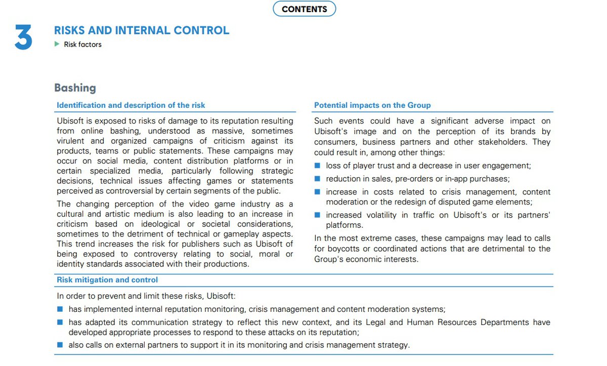 В документе отмечается, что кампании по травле Ubisoft могут предприниматься после принятия компанией стратегических решений, возникновения проблем в ее проектах или заявлений, считающихся спорными. Иногда такие кампании могут быть «массовыми, яростными и организованными».