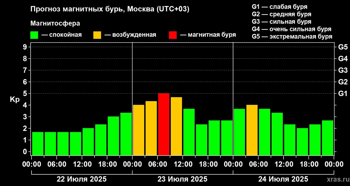 - Прогноз магнитных бурь на 22 июля: возможно умеренное возмущение