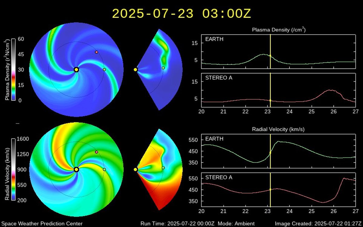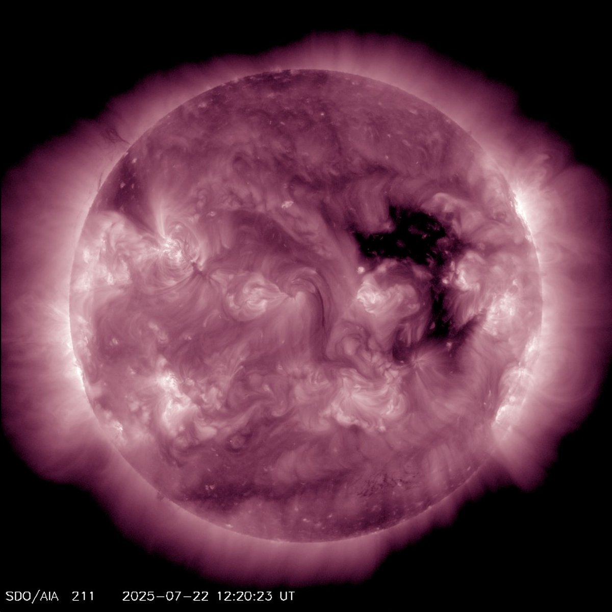 Кроме того, есть вероятность, что вечером 23 июля или в ночь на 24 июля магнитосфера Земли ощутит касательный удар филамента, оторвавшегося от Солнца 20 июля. Если это произойдет, то может наблюдаться небольшое возмущение магнитосферы.
