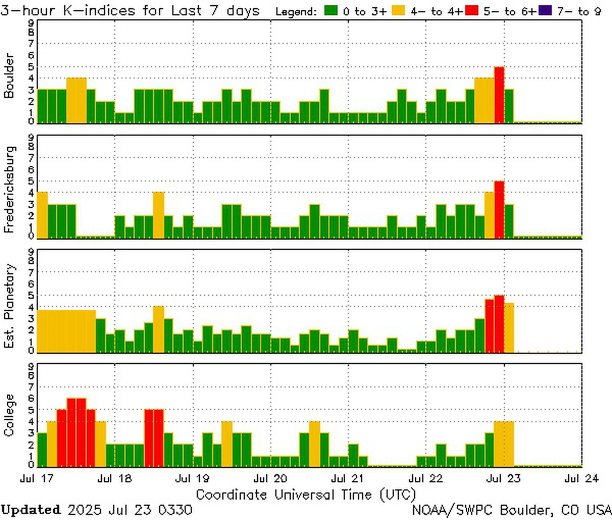 Кроме того, аналитики NOAA повысили прогноз по силе геомагнитной бури 23 июля. Теперь ожидается, что в пике буря достигнет класса G2, а не останется на уровне минимального класса G1.