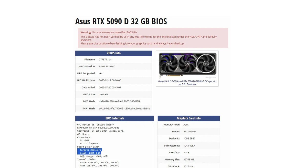 Интересный момент: предполагается, что неофициальный BIOS совместим не только с GeForce RTX 5090 D, но и со всеми моделями GeForce RTX 5090 от ASUS. Если это так, то BIOS может еще сильнее заинтересовать оверклокеров.
