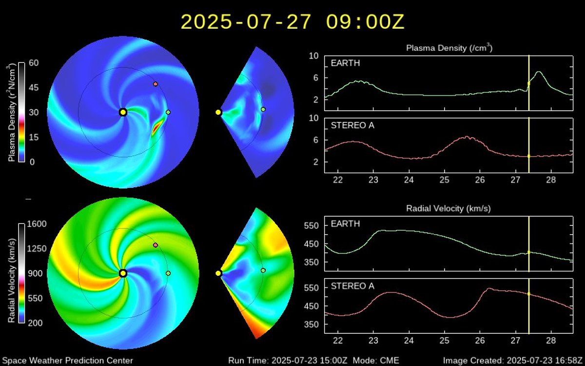 Аналитики допускали, что выброс доберется до Земли либо вечером 26 июля, либо ночью или утром 27 июля. Согласно актуальной модели распространения солнечного ветра, магнитная буря 27 июля все-таки начнется рано утром.