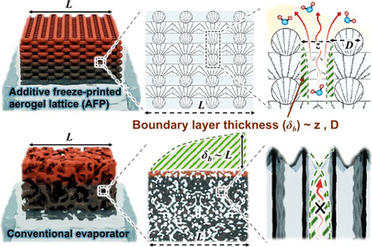 Каждый слой материала замораживается сразу после нанесения, это позволяет сформировать тонкие перегородки и равномерные микропоры. Эта конструкция способствует локализации тепла и более эффективной транспортировке пара, тем самым увеличивая выход пресной воды по сравнению с аналогичными материалами.