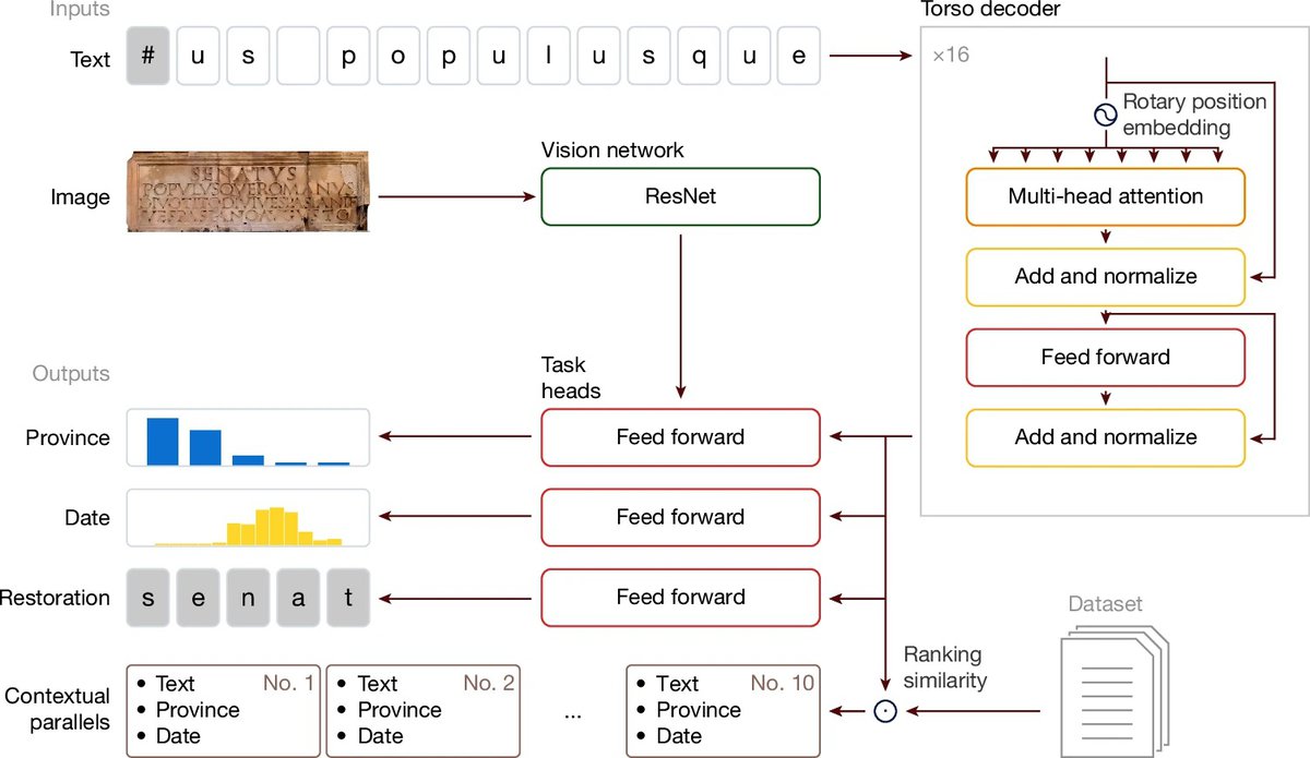 Aeneas представляет собой набор из нескольких нейросетей, занимающихся восстановлением текста, датировкой, географической привязкой и визуальным анализом. Например, определяются физические характеристики надписи вроде материала и расстояния между буквами.