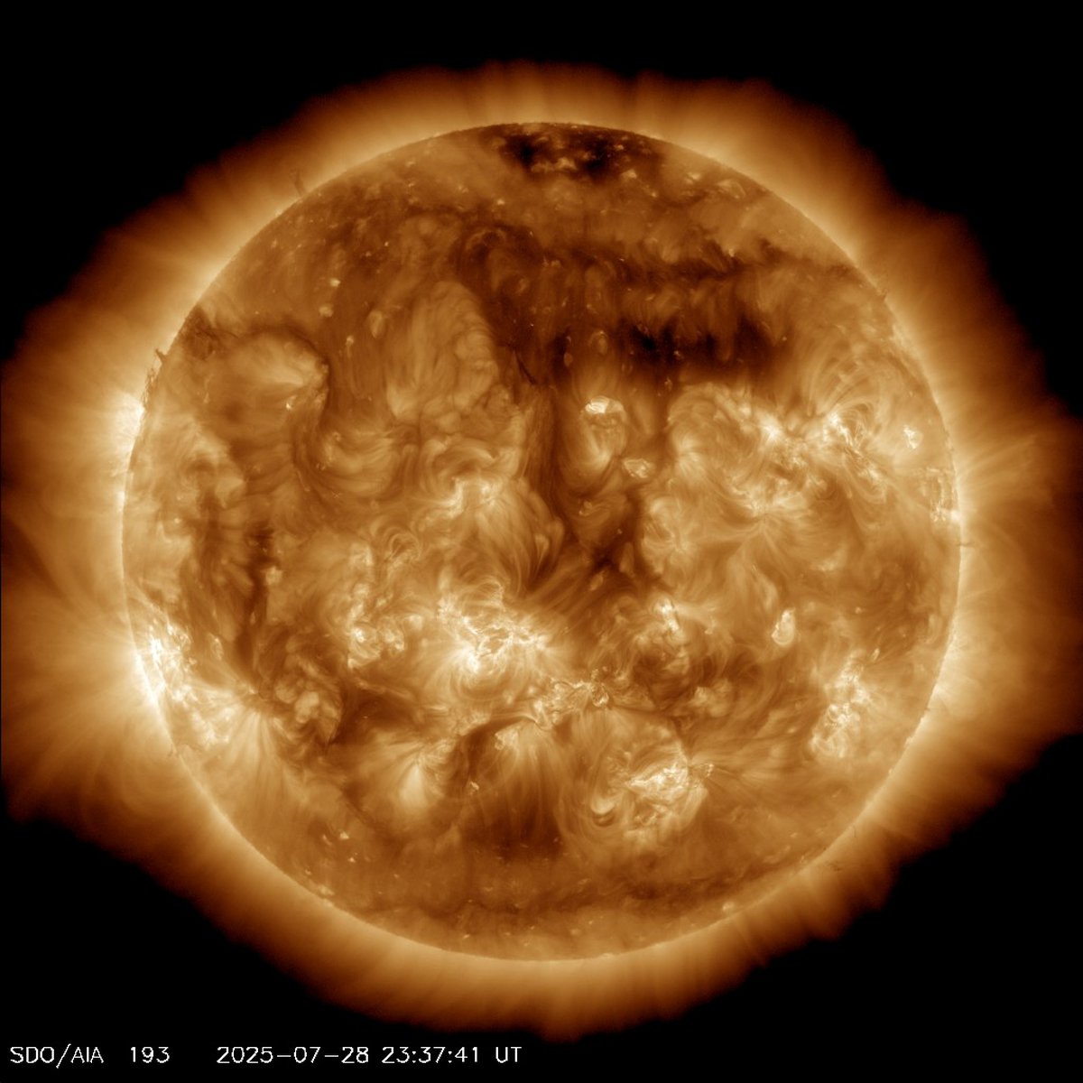 На снимках в ультрафиолетовом и рентгеновском диапазонах корональные дыры кажутся темными из‑за пониженной плотности и температуры солнечной плазмы. Ожидается, что поток солнечного ветра из полярной корональной дыры вскоре может оказаться в районе Земли.