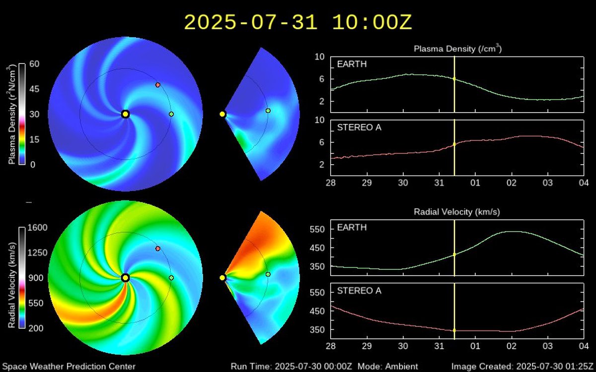 Согласно актуальной модели распространения солнечного ветра WSA-Enlil, Земля пройдет по краю потока солнечного ветра, а его скорость вечером 31 июля будет не выше 450 километров в секунду. Этого недостаточно для мощной геомагнитной бури.