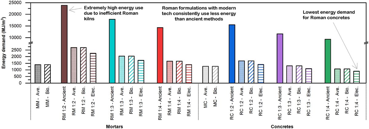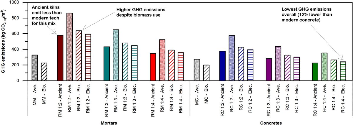 Сравнение с современным производством цемента, основанным на обжиге известняка и глины в промышленных печах, показало: римские рецепты дают сопоставимые или даже более высокие выбросы углекислого газа, но они экологичнее по другим параметрам.
