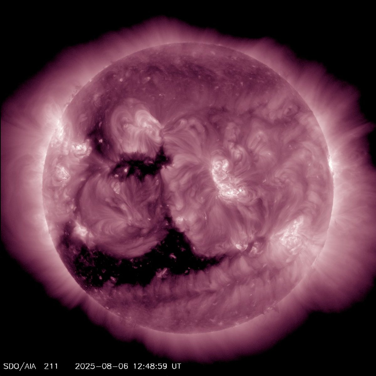 С другой стороны, существует вероятность, что магнитная буря 7/8 августа из-за коронального выброса будет усилена потоком солнечного ветра из корональной дыры, выходящей на центральный меридиан Солнца. В этом случае сила бури может достичь класса G2.