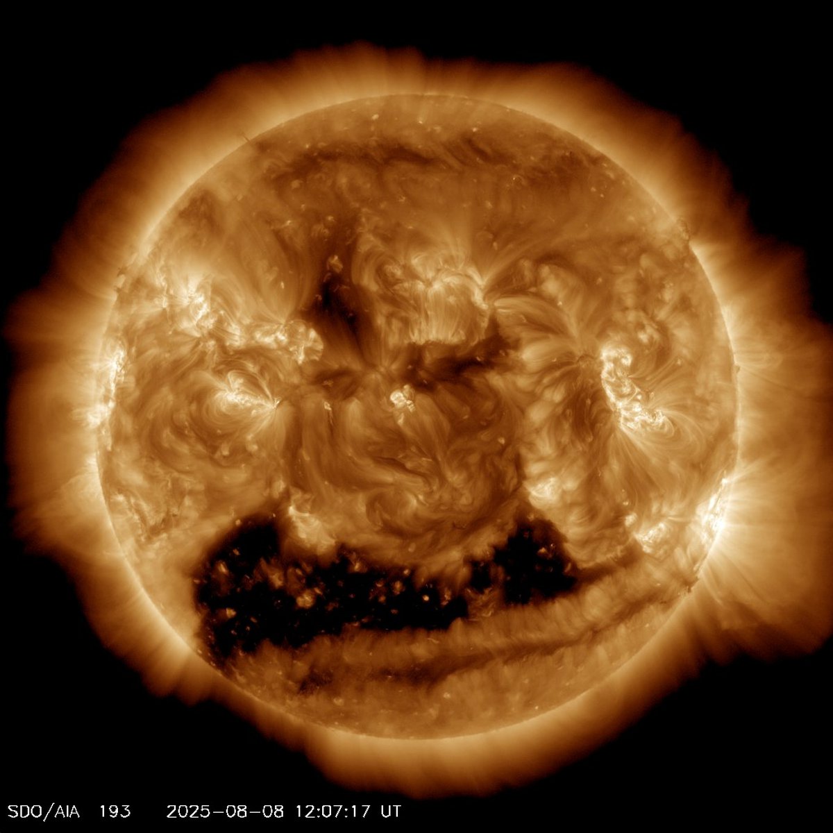 На обращенной к Земле части Солнца сейчас красуется внушительного размера корональная дыра — область в атмосфере звезды, где магнитные поля ослабли, а часть атмосферы улетела в космос. У нынешней дыры довольно примечательная форма.