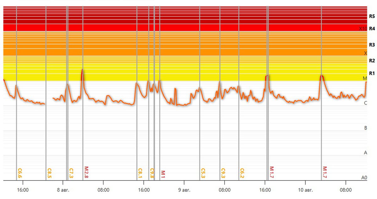 Вспышечная активность сохраняется на умеренном уровне. 9 и 10 августа произошло несколько вспышек предмаксимального класса M, сейчас вероятность вспышек класса M и максимального класса X оценивается в 55% и 10% соответственно.