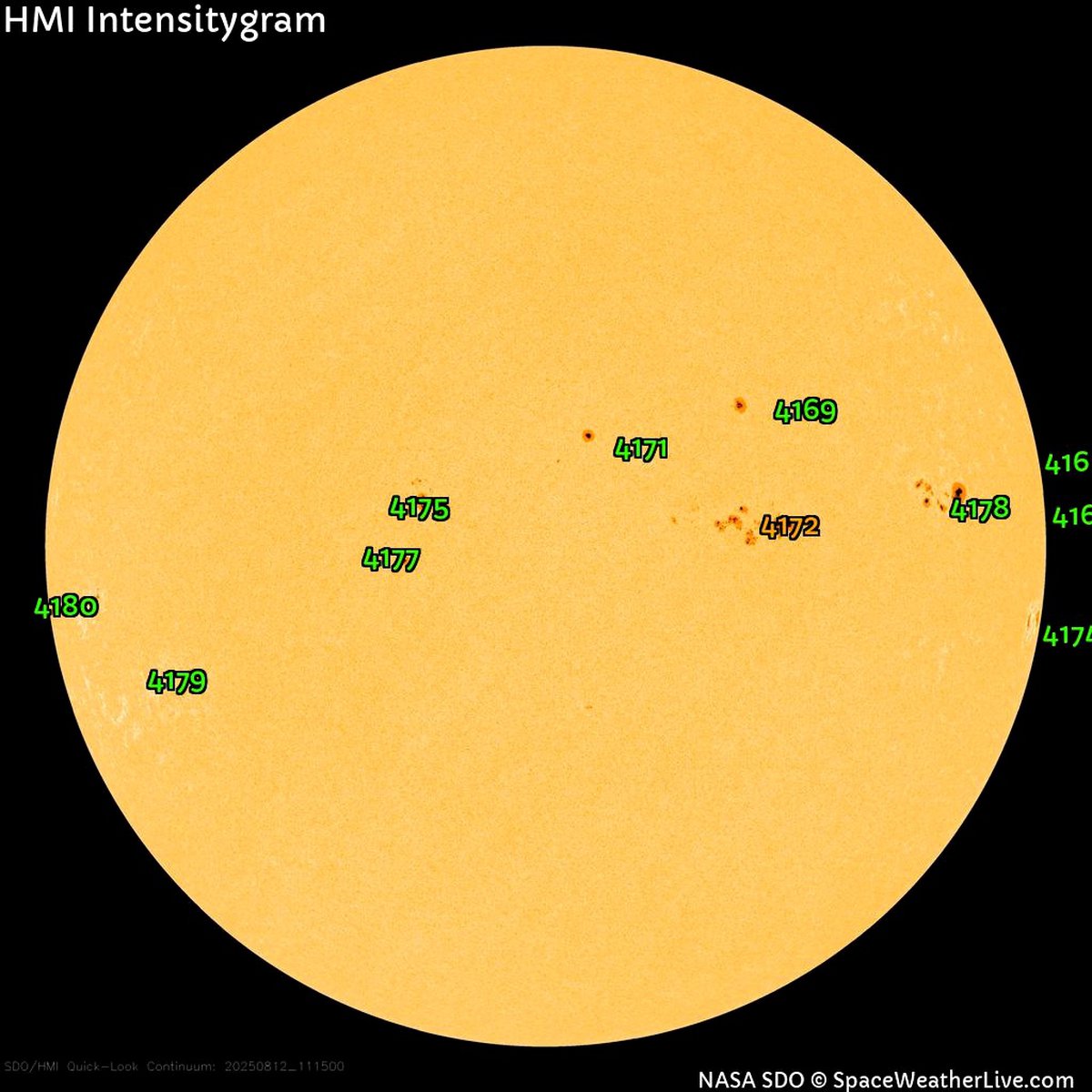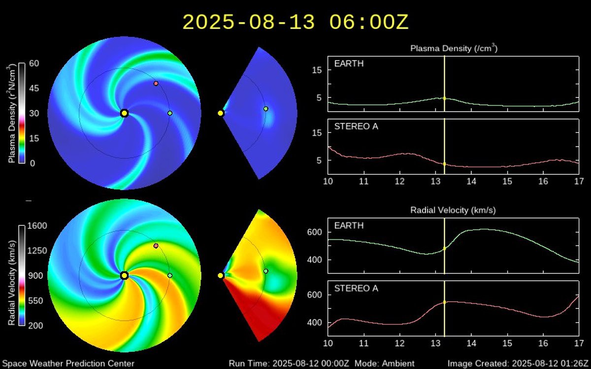 Отсутствие корональных выбросов массы снижает риск затяжных бурь, но не исключает коротких магнитных бурь 13 августа в период, когда быстрый поток солнечного ветра пересекается с межпланетным магнитным полем.
