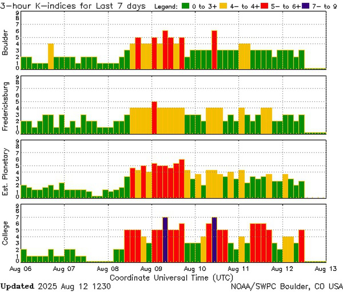 В начале суток, считают аналитики, индекс геомагнитной активности Kp будет на уровне 3-4 баллов. Возможны скачки активности, способные привести к магнитной буре: 13 августа ее сила ожидается на уровне минимального класса G1.