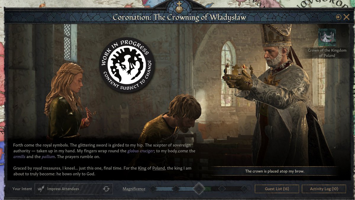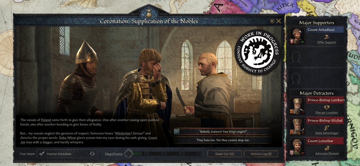 Коронация — особенно пышная — сможет положительно повлиять на отношения с соседними правителями и усилить влияние нового правителя на вассалов. Заодно удастся выяснить, как вассалы в действительности относятся к правителю.