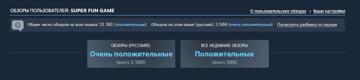Когда на определённом языке написано достаточно обзоров, Steam рассчитает для него отдельный рейтинг. Пользователи будут видеть рейтинг обзоров для своего основного языка. Это значит, что для одной и той же игры на некоторых языках могут отображаться более положительные рейтинги, а на других — более негативные.