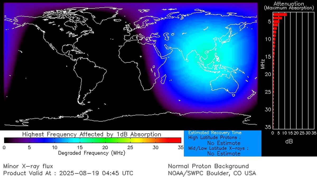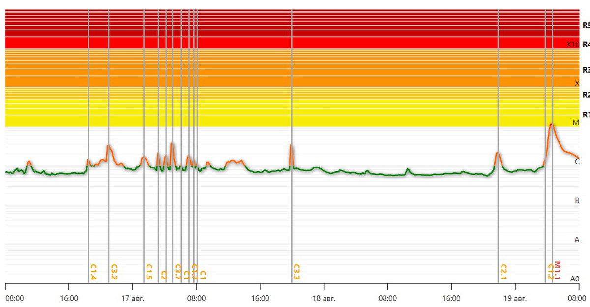 Рано утром 19 августа Солнце сгенерировало очень продолжительную вспышку. Пятно AR4188 выдало вспышку, растянувшуюся более чем на три часа; правда, она оказалась довольно слабой.