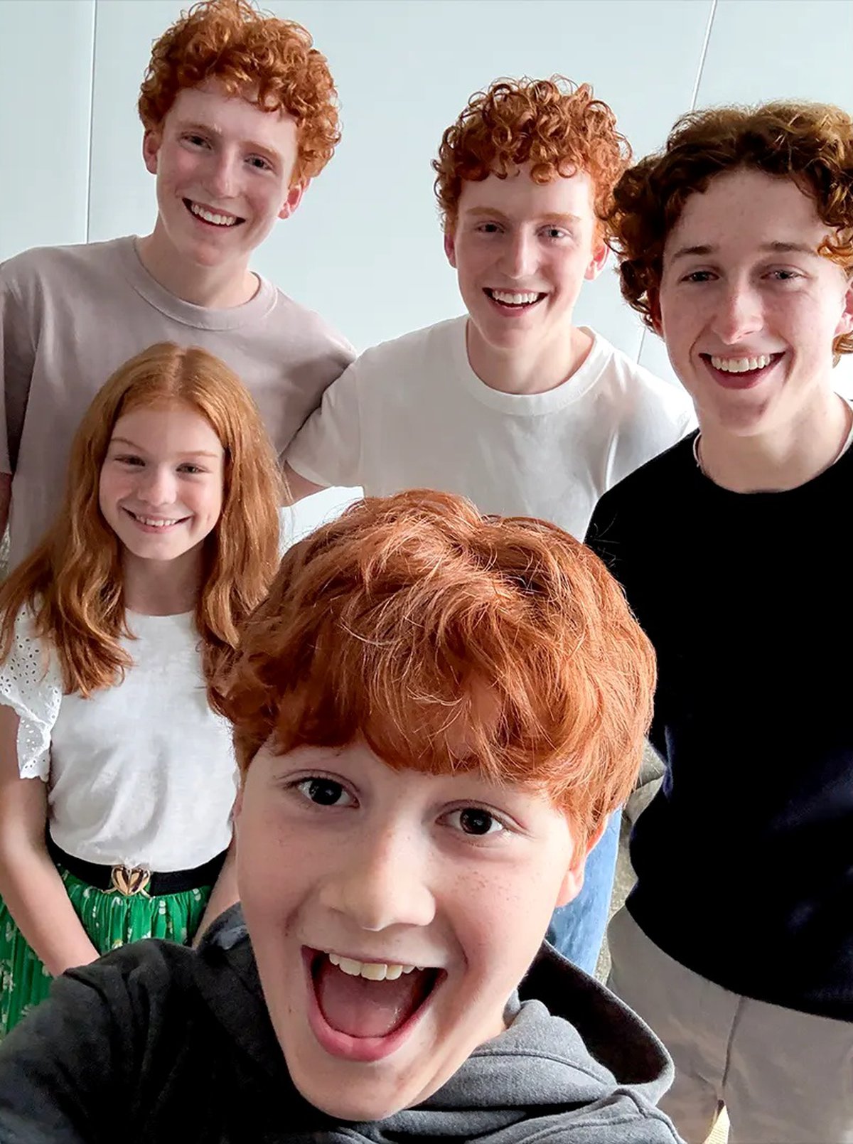 Помимо уже знакомого нам Аластера Стаута, играющего Рона Уизли, на фото попали (по часовой стрелке): Тристан и Габриэль Харланды в роли Фреда и Джорджа Уизли, Руари Спунер в роли Перси Уизли и Грейси Кокрейн в роли Джинни Уизли.