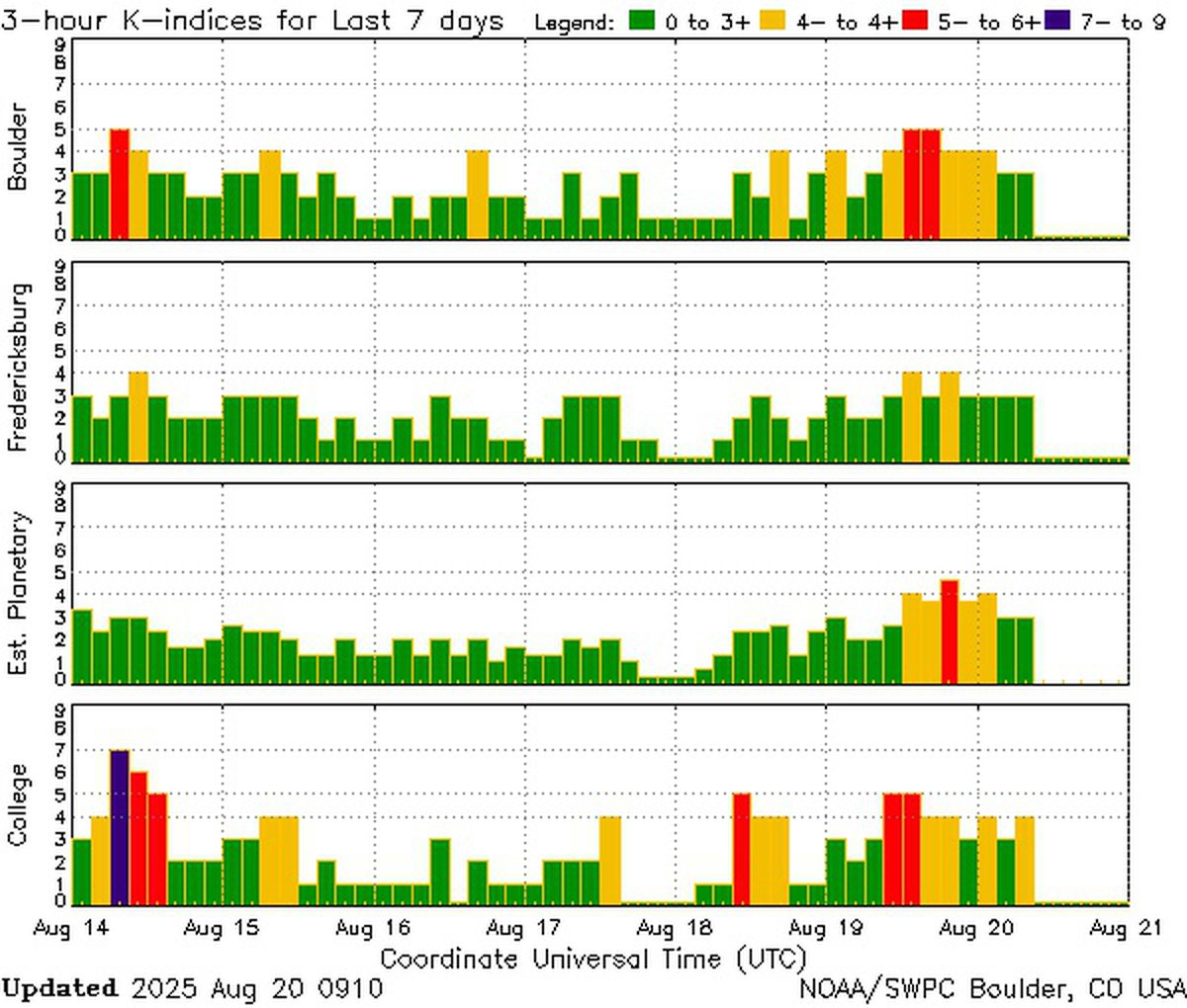 Ночью и утром 20 августа возмущение магнитосферы постепенно снижалось. Сейчас геомагнитная обстановка остается неспокойной, но уровень возмущения магнитосферы все-таки ниже полноценной магнитной бури.